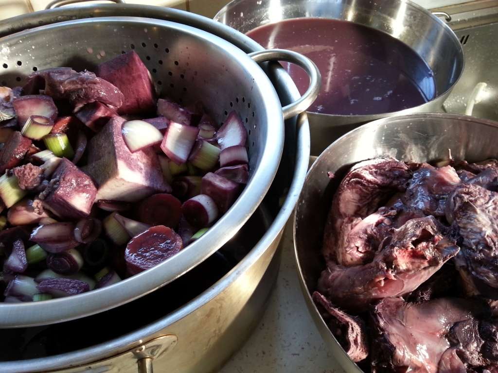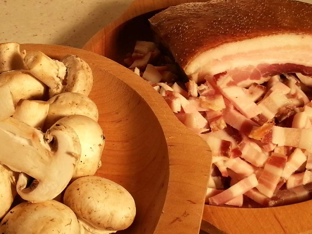 It’s 9 o’clock, on Wednesday morning. After two days of bathing in wine, it’s time to start the preparation of the coq au vin. The liquid is strained and the meat is separated from the vegetables. In a very large, well oiled cooking pan, the pieces of meat are browned thoroughly on every side. After removing the meat, I toss the vegetables in the pan so they get caramelized in the oil infused with cocoș flavor. But in between the vegetables I never forget to place a few chunks of slănina, a very nicely slated and smoked cut of pork fat with the rind attached. This will add another dimension to the tartness of the wine sauce.